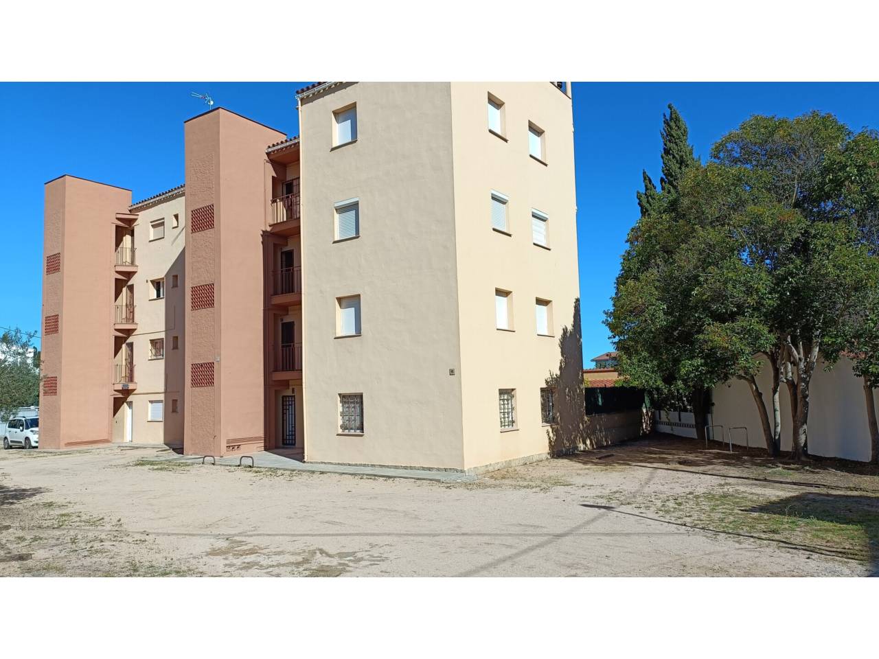 Forma part d’una construcció del 1971 situada a Riells, està en una zona tranquil·la, a 650 metres de la platja i 550 metres del Carrefour. Disposa de zona comunitària on deixar el cotxe (sense espais reservats).